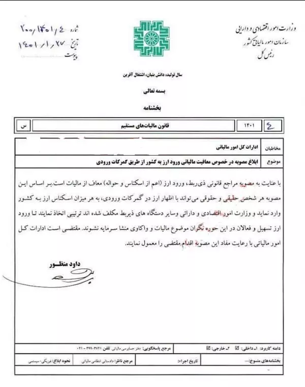 به گزارش بازار، داوود منظور معاون وزیر اقتصاد و رئیس سازمان امور مالیاتی، مصوبه نهادهای قانونی ذی‌ربط مبنی بر معافیت مالیاتی واردات ارز اعم از اسکناس یا حواله از مبادی گمرکات اجرایی به کشور را ابلاغ کرد.