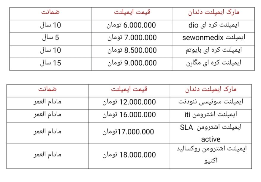 برای مشاهده قیمت انواع ایمپلنت دندان مثل ایمپلنت کره ای – ایمپلنت سوئیسی – ایمپلنت آمریکایی و ... به لینک زیر مراجعه کنید.