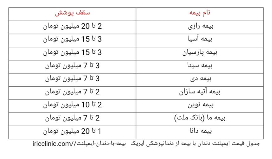 همانطور که در جدول بالا مشاهده کردید هر کدام از بیمه ها برای ایمپلنت دندان مقداری را پوشش می دهند که متفاوت است و بر اساس شرایط افراد ممکن است تغییر کند.