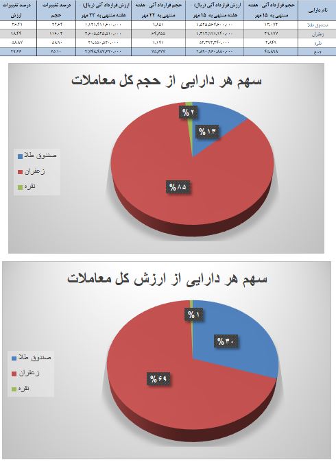 از لحاظ حجم و ارزش، زعفران به ترتیب با سهم ۸۵ درصدی و ۶۹ درصدی بیشترین سهم را از کیک معاملات قراردادهای آتی در اختیار داشت و صندوق طلا با سهم ۱۳ درصدی از حجم کل و ۳۰ درصدی از ارزش کل در جایگاه دوم قرار داشت.
