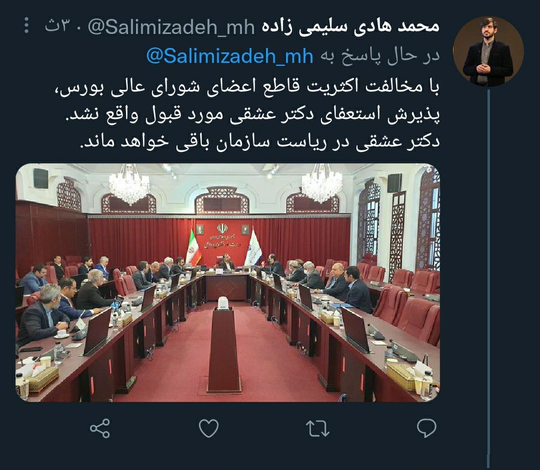 مدیر روابط عمومی سازمان بورس نوشت: با مخالفت اکثریت قاطع اعضای شورای عالی بورس، پذیرش استعفای مجید عشقی مورد قبول واقع نشد.