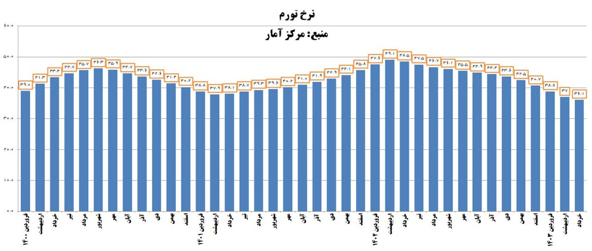 نرخ تورم سالانه برای خانوارهای کشور در خرداد ماه ۱۴۰۳ به ۳۶.۱ درصد رسیده که نسبت به اردیبهشت ماه سال جاری، ۰.۹ واحد درصد کاهش یافته است. منظور از نرخ تورم سالانه، درصد تغییر میانگین اعداد شاخص قیمت در یک سال منتهی به ماه جاری، نسبت به دوره مشابه قبل از آن میباشد.