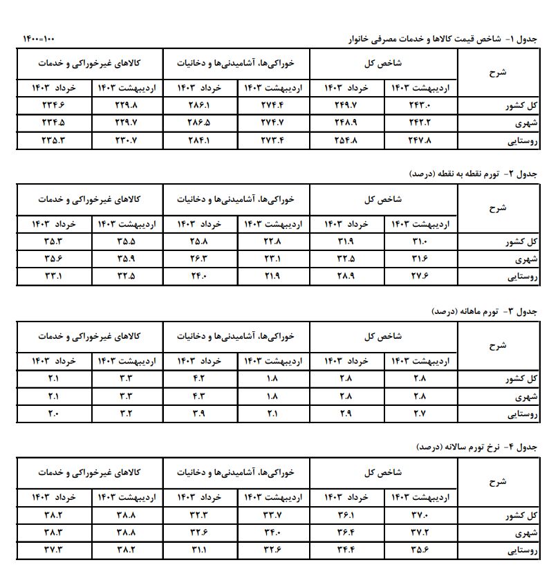 تورم ماهانه خانوارهای کشور در خرداد ماه ۱۴۰۳ برابر ۲.۸ درصد بوده است. تورم ماهانه برای گروههای عمده «خوراکیها، آشامیدنیها و دخانیات»، ۴.۲ درصد و برای گروه عمده «کالاهای غیرخوراکی و خدمات»، ۲.۱ درصد بوده است. منظور از تورم ماهانه، درصد تغییر عدد شاخص قیمت، نسبت به ماه قبل میباشد.