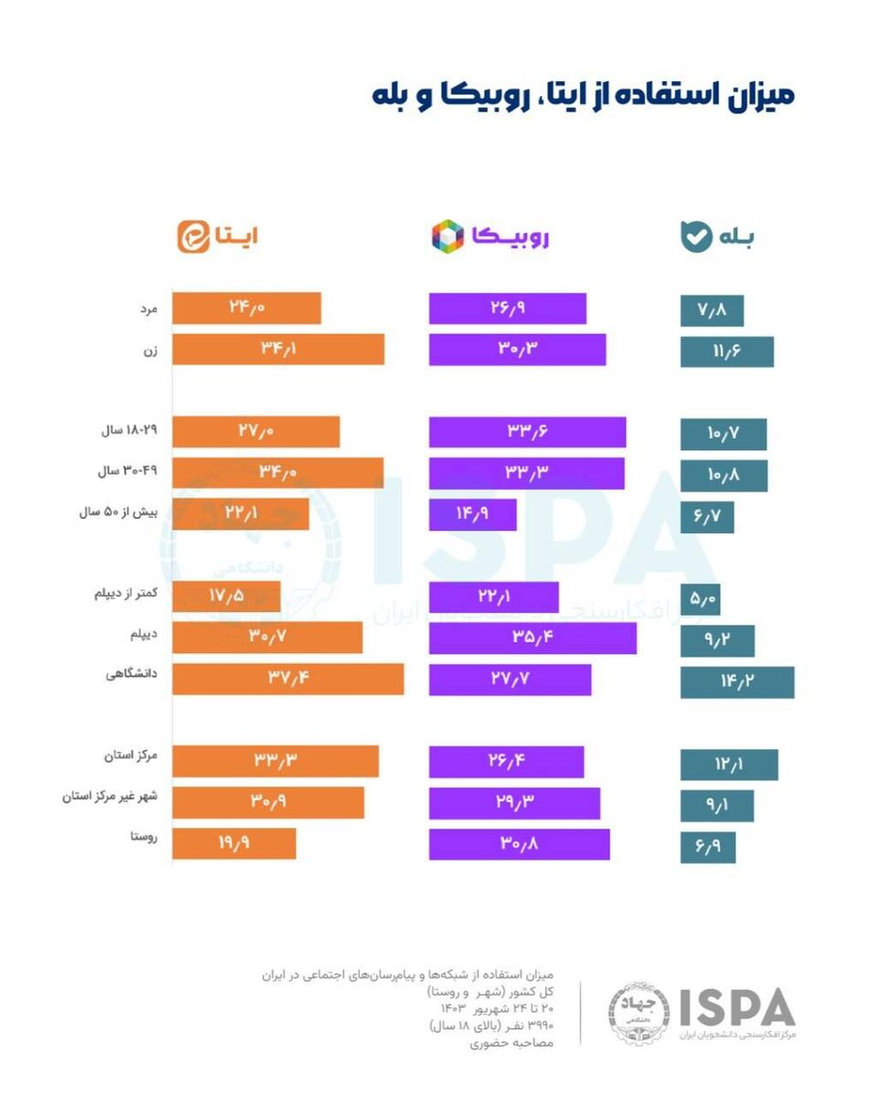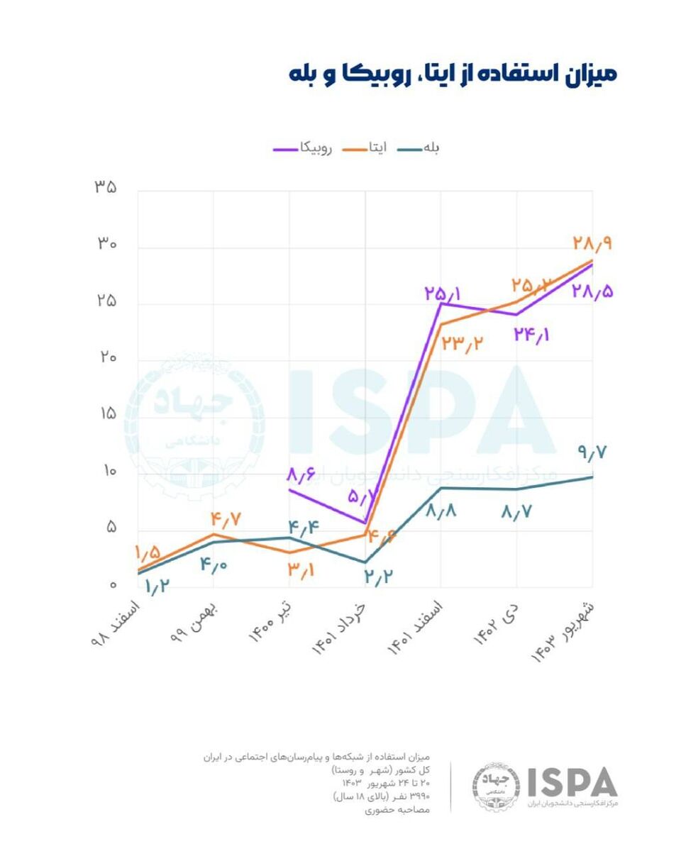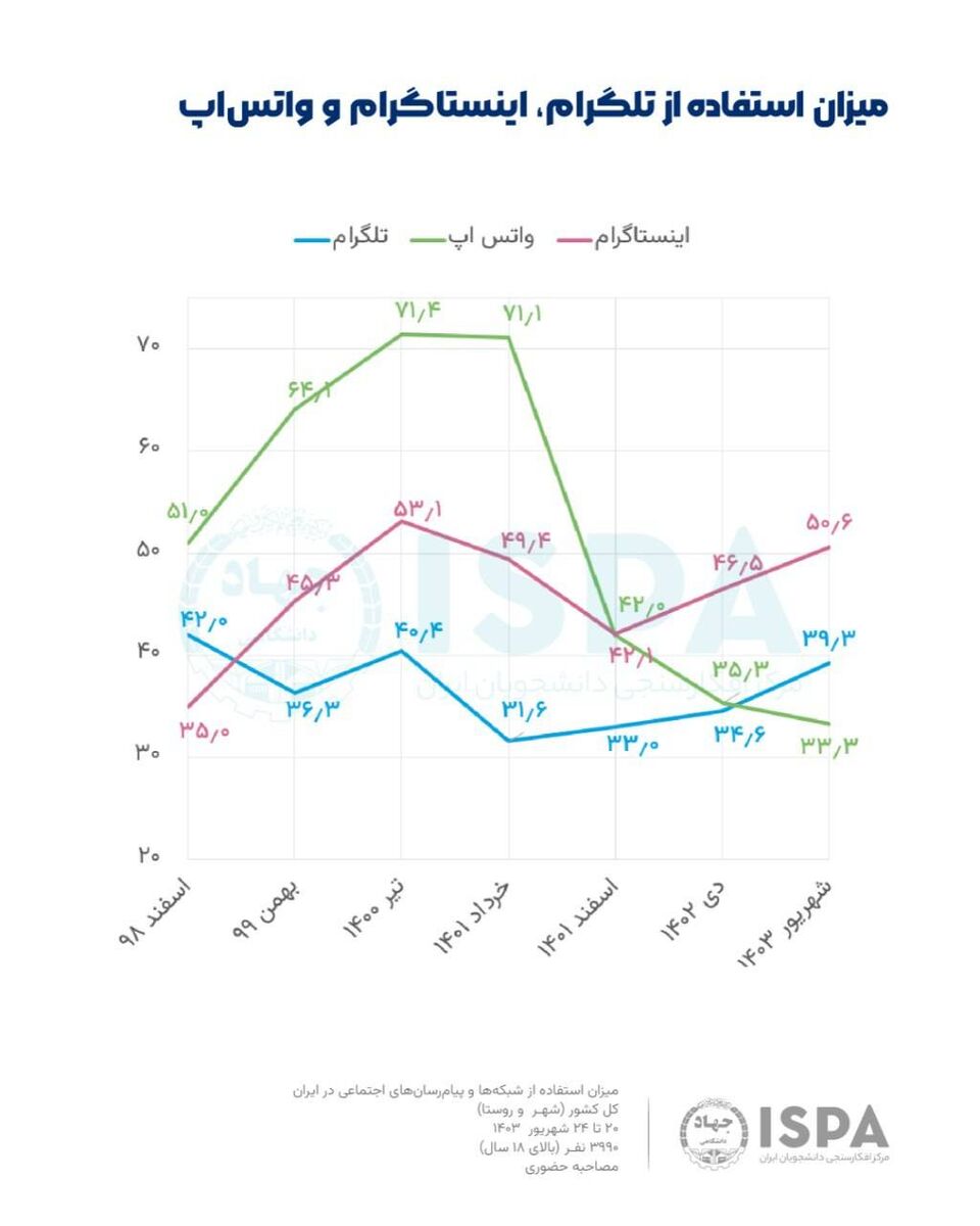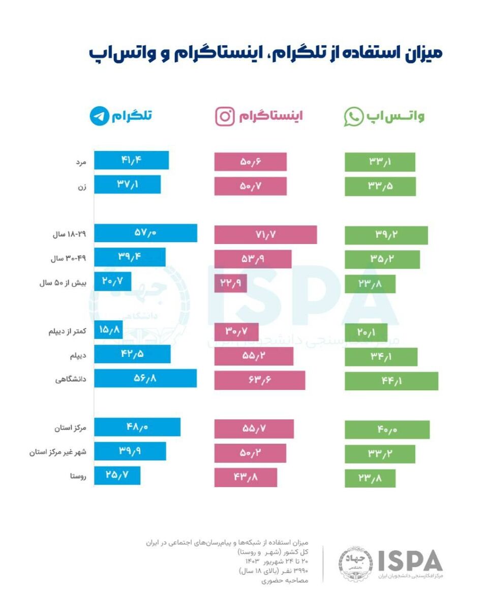 نتایج جدیدترین نظرسنجی ملی ایسپا در خصوص میزان استفاده ایرانیان ‏بالای ۱۸ سال ساکن در مناطق روستایی و شهری کشور از پیام‌رسان‌ها و ‏شبکه‌های اجتماعی منتشر شد.‏