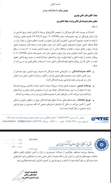 احتراماً به پیوست نامه اتاق هرمزگان در خصوص نگرانیهای مرتبط با افزایش قیمت برنج خارجی در بازار استان هرمزگان در مورد تصویب نامه شماره ۰۲۰/۱۶۲۷۶۵ تاریخ ۱۷ مهر ۱۴۰۳، تقدیم حضور میگردد. با توجه به اهمیت موضوع کمیسیون کشاورزی اتاق ایران همواره بر اهمیت تنظیم متوازن و پایدار بازار در نقاط مختلف کشور، بهویژه استانهای جنوبی تأکید دارد.