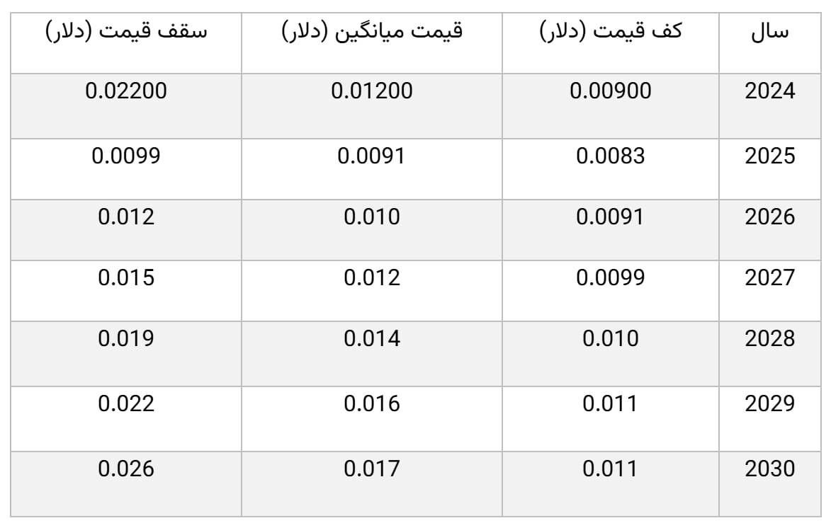 • پیش‌بینی قیمت نشان می‌دهد که احتمالاً در سال ۲۰۲۴ به سقف ۰.۰۲۲ دلار خواهد رسید.