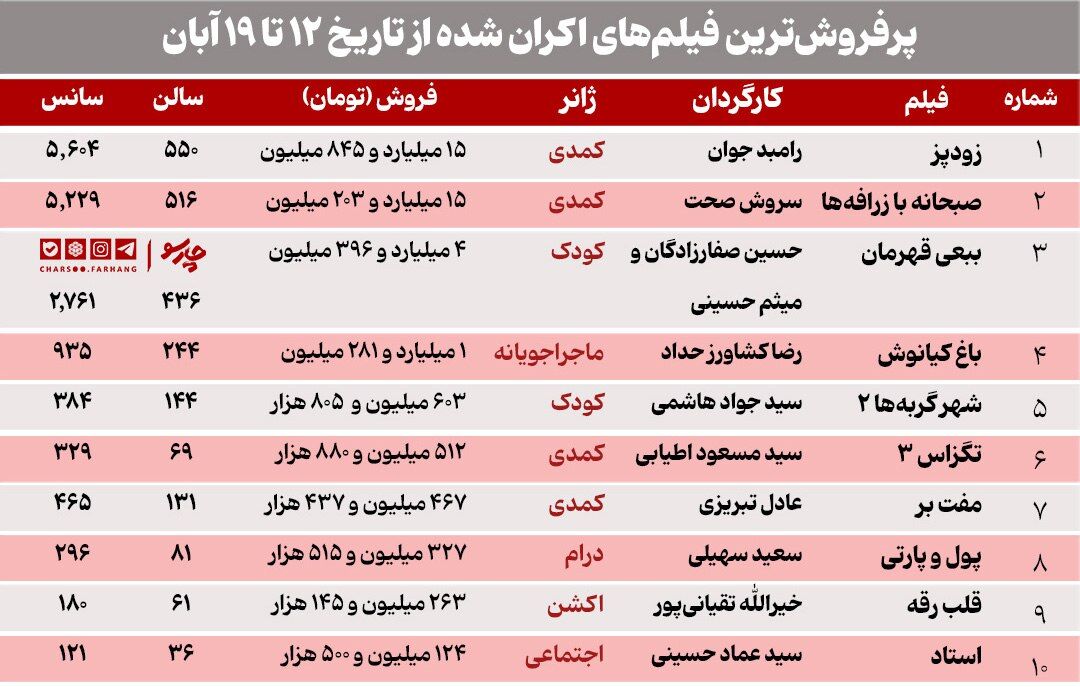 فیلم شهر گربههای ۲، تگزاس ۳، مفتبر، پول و پارتی و قلب رقه مانند هفته قبل در لیست پرفروشترین فیلمها قرار دارند که به ترتیب و با اختلاف نسبتا کمی در جدول قرار گرفتهاند. فیلم اجتماعی «استاد» موفق شد که رتبه دهم را کسب کند و در لیست ۱۰ فیلم پرفروش هفته گذشته قرار بگیرد.