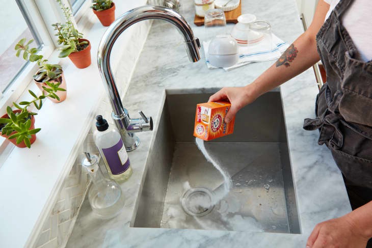 · جوش شیرین و آب لیمو: ترکیب جوش شیرین و آب لیمو یک پاک کننده طبیعی و قوی است. برای این کار مقداری جوش شیرین را با آب لیمو مخلوط کنید تا خمیری شود. سپس خمیر را روی سینک بمالید و به مدت ۱۵ دقیقه بگذارید بماند. سپس با آب گرم بشویید و خشک کنید.