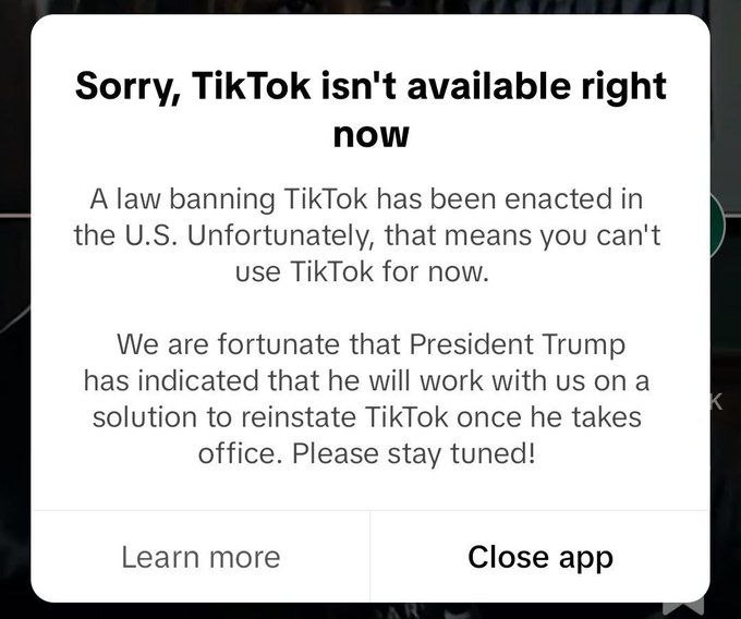 در بیانیه تیکتاک آمده است: «متأسفانه قانون ممنوعیت (فعالیت) تیک تاک در آمریکا اجرایی شد و این یعنی هماکنون شما نمیتوانید از تیکتاک استفاده کنید.»