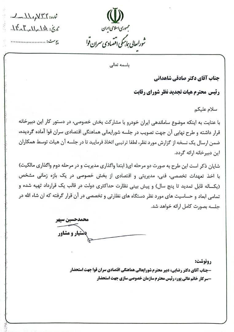 این نامه همچنین تأکید دارد که طرح نهایی واگذاری ایرانخودرو برای تصویب در جلسه شورای عالی هماهنگی اقتصادی سران قوا آماده شده است. در همین راستا، نسخهای از این گزارش برای سازمان خصوصیسازی نیز ارسال شده است.