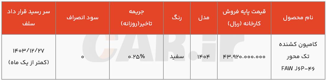 زمان تحویل کامیون کشنده تکمحور فاو J۶P-۴۶۰ در بورس کالا، کمتر از سی روز و ۲۷ اسفند ماه تعیین شده است.