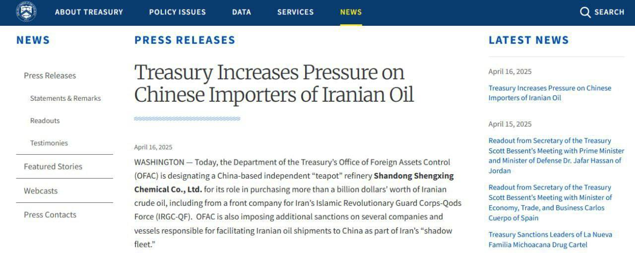 به گزارش بازار، وزارت خزانهداری آمریکا اعلام کرد که دفتر کنترل داراییهای خارجی (OFAC) یک پالایشگاه مستقل مستقر در چین به نام شرکت شیمیایی شاندونگ شنگشینگ (Shandong Shengxing Chemical Co., Ltd) را به بهانه نقش آن در خرید بیش از یک میلیارد دلار نفت خام ایران تحریم میکند.