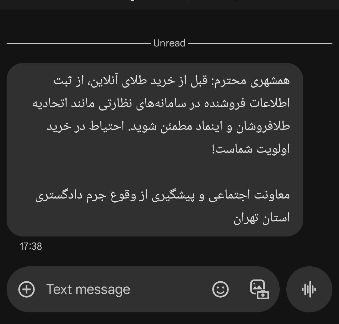 به گزارش بازار، در پیامک معاونت اجتماعی و پیشگیری از وقوع جرم قوه قضاییه استان تهران که به صورت سراسری امروز چهارشنبه سوم اردیبهشت برای همه شهروندان تهرانی ارسال شد، آمده است: «همشهری محترم: قبل از خرید طلای آنلاین، از ثبت اطلاعات فروشنده در سامانههای نظارتی مانند اتحادیه طلافروشان و اینماد مطمئن شوید. احتیاط در خرید اولویت شماست!»