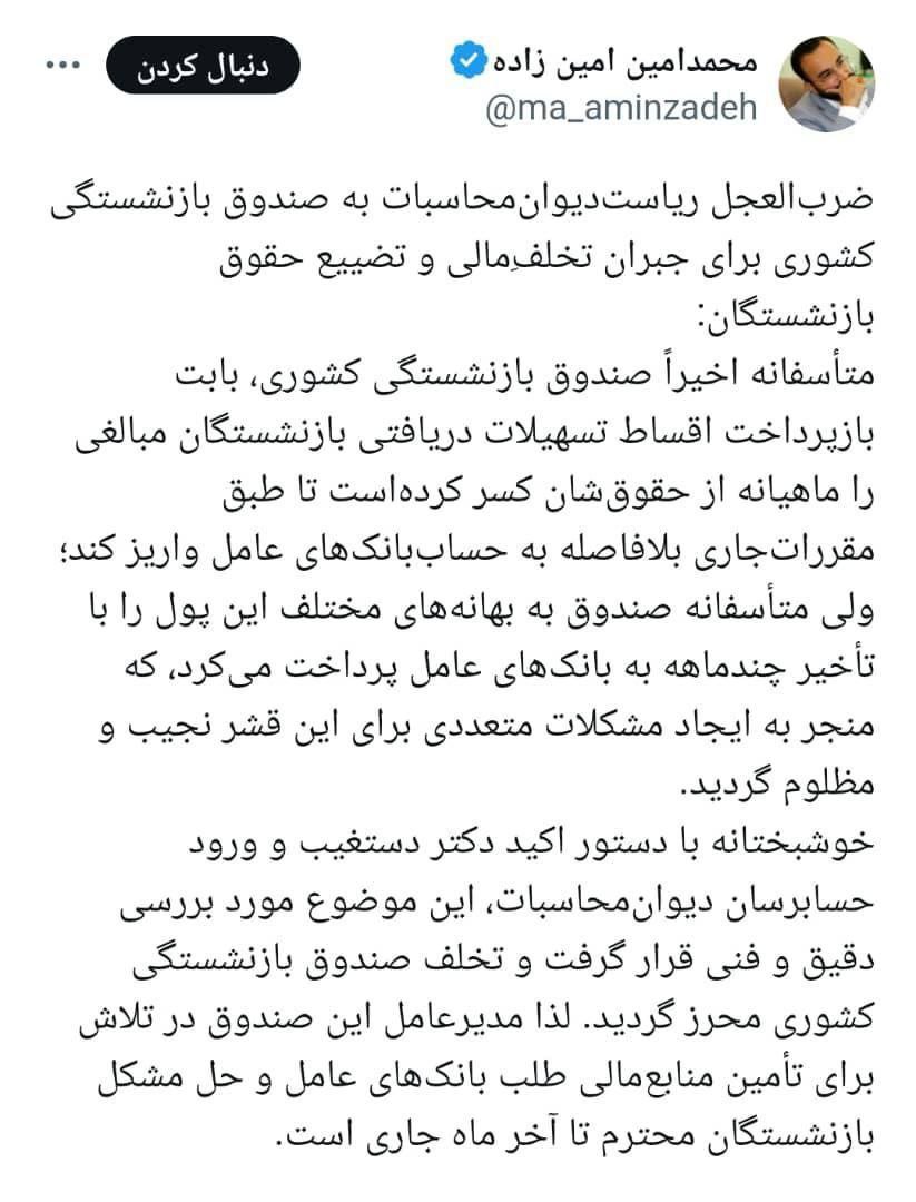 خوشبختانه با دستور اکید دکتر دستغیب و ورود حسابرسان دیوان محاسبات، این موضوع مورد بررسی دقیق و فنی قرار گرفت و تخلف صندوق بازنشستگی کشوری محرز گردید. لذا مدیرعامل این صندوق در تلاش برای تأمین منابع مالی طلب بانکهای عامل و حل مشکل بازنشستگان محترم تا آخر ماه جاری است.
