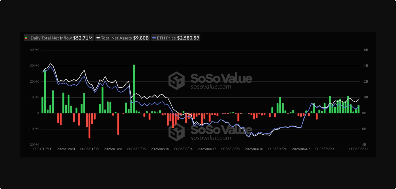 ETFهای اتریوم مبتنی بر بازار ایالات متحده، به رهبری صندوق تراست اتریوم بلک راک (ETHA)، در تاریخ ۹ ژوئن ورودیهایی به مجموع ۵۲.۷ میلیون دلار ثبت کردند و ۱۶ روز متوالی از ورودیها را به مبلغ ۸۹۰ میلیون دلار ثبت کردند.