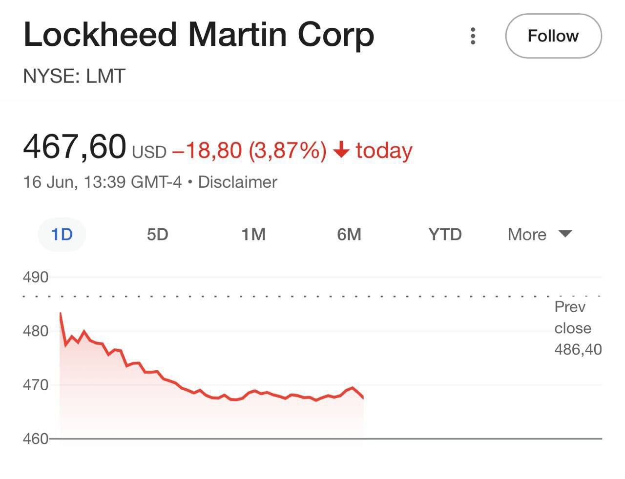 به گزارش بازار، شرکت دفاعی لاکهید مارتین، تولیدکننده هواپیماهای F-۳۵، کاهش قابلتوجهی در قیمت سهام خود را تجربه کرده است.
