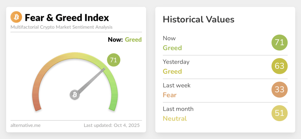 در همین حال، شاخص مشابه در پلتفرم Alternative.me به عدد ۷۱ رسیده که بیانگر «طمع» آشکار در بازار است؛ در حالیکه هفته گذشته در سطح ۳۳ و در محدوده «ترس» قرار داشت. به گفته تحلیلگران، چنین جهشی معمولاً نشانهای از تغییر سریع احساسات بازار است و میتواند پیشدرآمد یک اصلاح قیمتی باشد.
