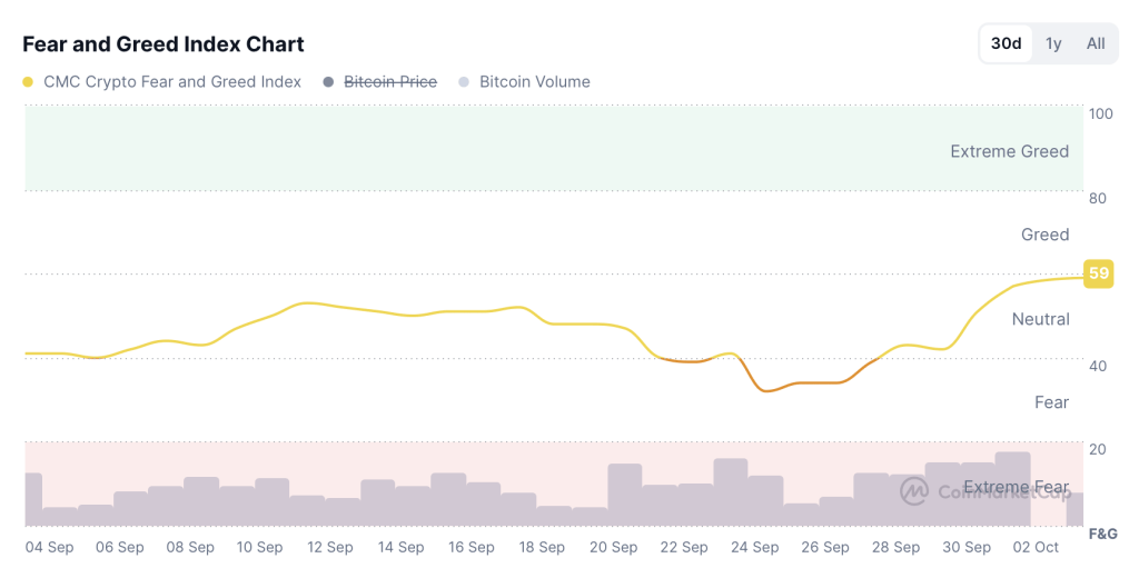 بر اساس دادههای وبسایت کوینمارکتکپ (CMC)، شاخص ترس و طمع (Fear & Greed Index) اکنون عدد ۵۹ از ۱۰۰ را نشان میدهد. این سطح هنوز «خنثی» محسوب میشود، اما در آستانه ورود به ناحیه «طمع» قرار دارد. این شاخص در ابتدای ماه اکتبر روی عدد ۵۱ بود و طی چند روز رشد ۱۵,۶۹ درصدی را تجربه کرده است.