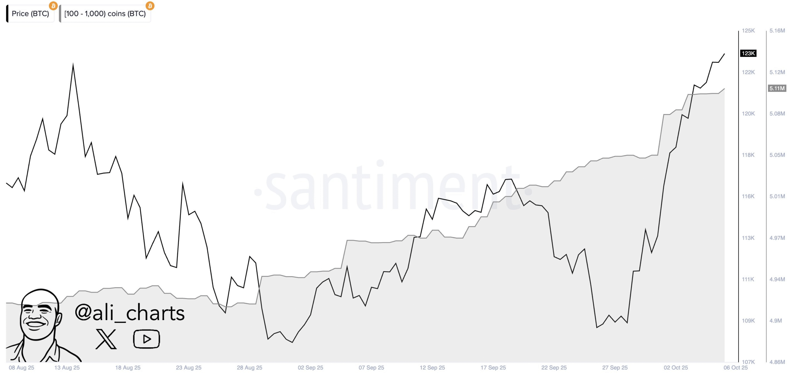 بر اساس دادههای آدرسهای کیف پول حاوی ۱۰۰ تا ۱۰۰۰ بیت کوین، بیش از ۶۰ هزار واحد در هفته گذشته اضافه شده و موجودی این آدرسها به ۵.۱۱ میلیون بیت کوین رسیده است. این تغییر پس از دوره انباشت که از آگوست آغاز شده بود، در اوایل اکتبر به اوج خود رسید.