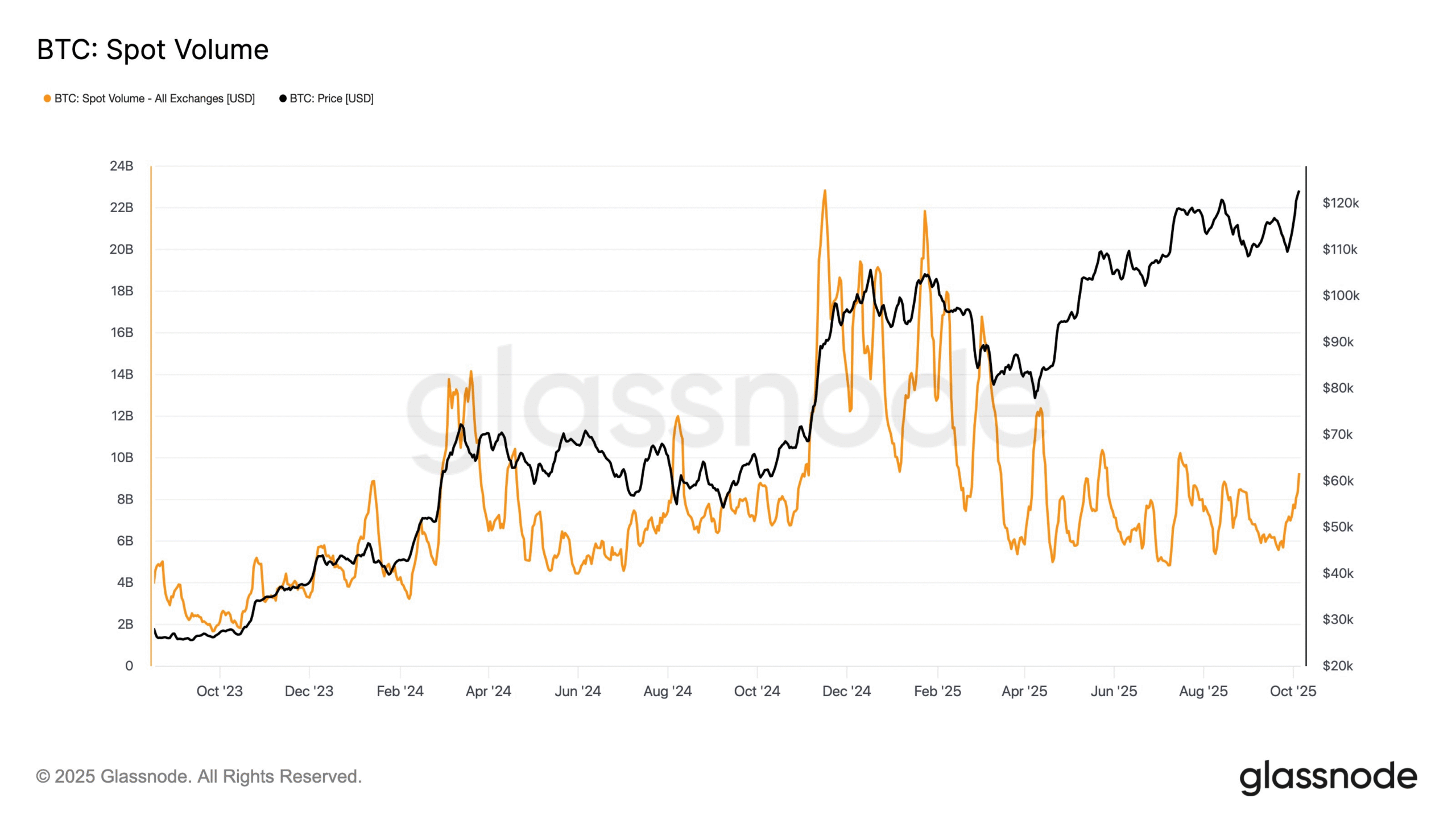 بر اساس نمودار ارائه شده، حجم معاملات اسپات در سپتامبر به سطح نسبتاً پایینی کاهش یافته بود که نشاندهنده کاهش فعالیت معاملاتی در پلتفرمهای اسپات بود. این روند با خروج بیتکوین از فاز تثبیت و صعود به بالای ۱۲۵۰۰۰ دلار معکوس شد. اگرچه این افزایش حجم چشمگیر بوده، اما هنوز به سطوح ثبتشده در اواخر ۲۰۲۴ و اوایل ۲۰۲۵ نرسیده است.