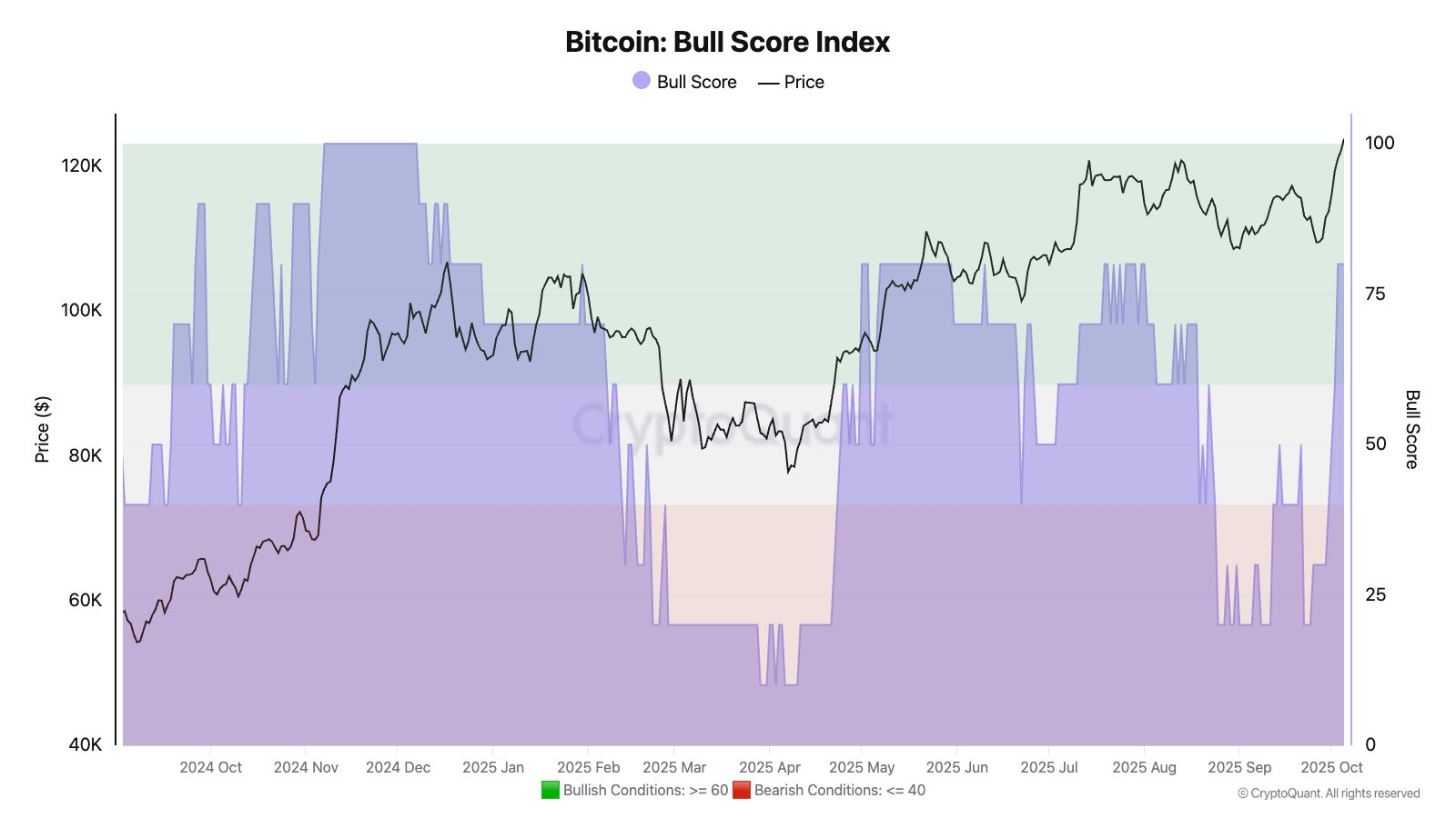 همزمان با این تحولات، شاخص امتیاز گاوی (Bull Score Index) کوینمارکتکپ که از دادههای شاخصهای مختلف درونزنجیرهای برای تعیین فاز بازار استفاده میکند، به سطح ۸۰ صعود کرده که در منطقه «گاوی» قرار دارد. این شاخص تأیید میکند که بازار در فاز صعودی قدرتمندی قرار گرفته است.