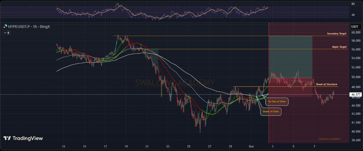 در نمودار ۱ ساعته HYPE/USDT، قیمت پس از کاهش از ۵۸ به ۴۰.۵ دلار، روند بهبودی را آغاز کرده و هماکنون در ۴۶.۵۸ دلار معامله میشود. شکست ساختار نزولی اخیر و بازگشت شاخصهای میانگین متحرک به وضعیت صعودی، نشاندهنده سیگنالهای مثبت فنی است. در صورت تداوم فشار خرید، قیمت HYPE میتواند مقاومت ۵۶ و سپس ۶۰ دلار را هدفگیری کند.