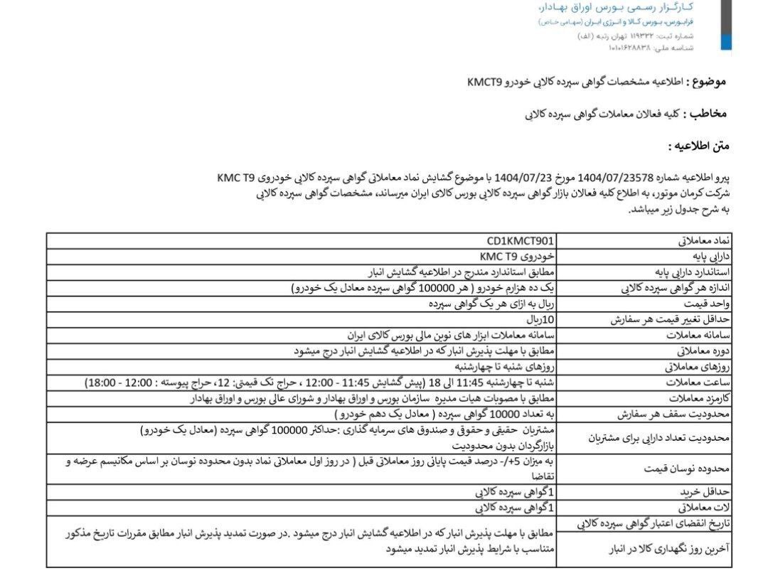 به گزارش بازار، دوشنبه ۲۸ مهر ۱۴۰۴، شرکت کرمان موتور با همکاری گروه مالی کارآمد، برای نخستین بار در صنعت خودروسازی اقدام به عرضه گواهی سپرده خودرویی KMC T۹ در بورس کالای ایران میکند. در این عرضه، در حال حاضر بیش از ۳۰۰ دستگاه از این پیکاپ دو دیفرانسیل در پارکینگ زیر نظر بورس کالا نگهداری شده و هر خودرو در قالب ده هزار واحد گواهی سپرده در بازار معامله خواهد شد.