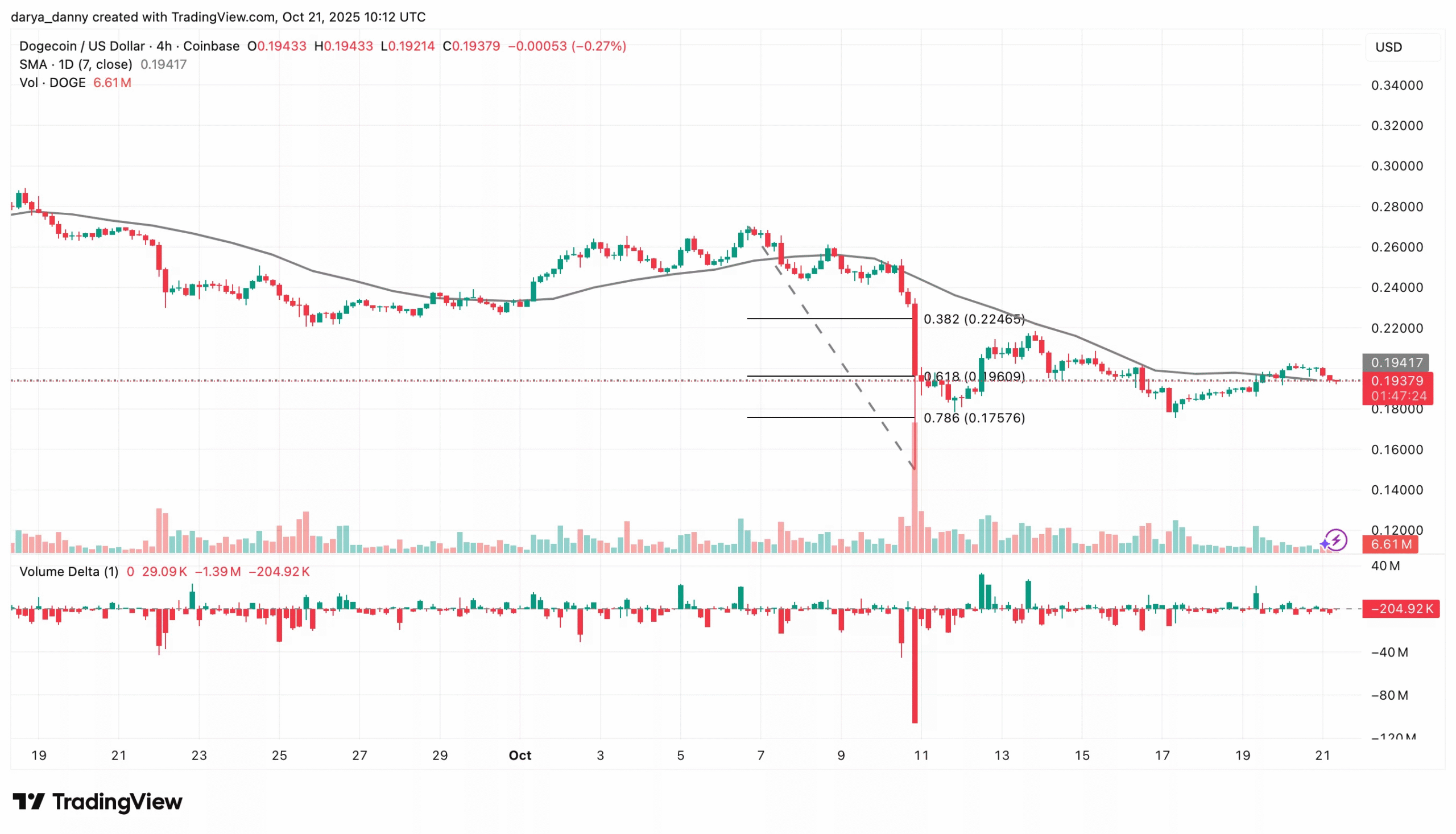 به گزارش دریا ناسیِدکینا (Darya Nassedkina) از کوینمارکتز (CoinMarkets)، دادهها نشان میدهد که قیمت دوج کوین بالای محدوده حمایتی ۰,۱۸ دلار در حال تثبیت است و هر افت قیمتی توسط خریداران جذب میشود. در جریان سقوط ناگهانی ۱۰ اکتبر، زمانی که ارزش کل بازار حدود ۱۹ میلیارد دلار کاهش یافت و دوج کوین تا ۰,۱۵ دلار افت کرد، خریداران از فرصت استفاده کرده و دارایی خود را افزایش دادند.