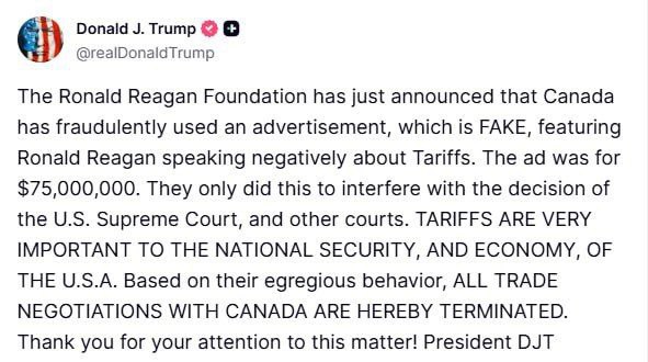 ترامپ رییسجمهور امریکا در پستی نوشت: «بنیاد رونالد ریگان بهتازگی اعلام کرده که کانادا بهطور جعلی از یک آگهی تبلیغاتی استفاده کرده است که ساختگی (FAKE) بوده و در آن رونالد ریگان بهطور منفی درباره تعرفهها صحبت میکند. هزینه این آگهی ۷۵٬۰۰۰ دلار بوده است. آنها فقط این کار را کردند تا در تصمیم دیوان عالی ایالات متحده و سایر دادگاهها دخالت کنند. تعرفهها برای امنیت ملی و اقتصاد ایالات متحده بسیار مهم هستند. با توجه به رفتار فریبکارانهشان، تمام مذاکرات تجاری با کانادا از همین لحظه پایان مییابد.»
