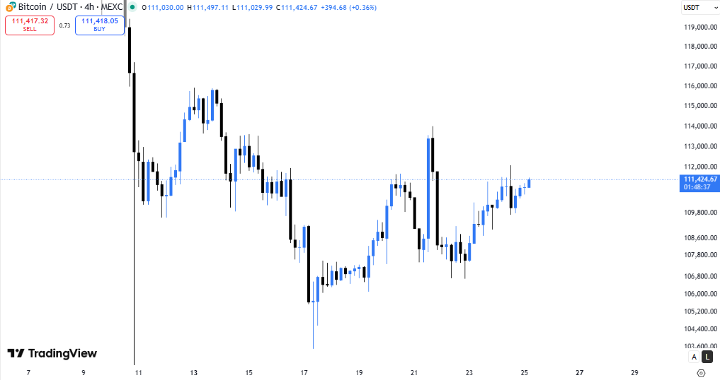 با وجود این خوشبینیها، بیت کوین پس از لمس سطح ۱۱۲ هزار دلار، در محدوده ۱۱۱ هزار دلار نوسان کرد. تحلیلگران میگویند مقاومت اصلی در همین محدوده قرار دارد و حمایتهای مهم بعدی در سطوح پایینتر از ۱۱۰ هزار دلار شکل گرفته است.