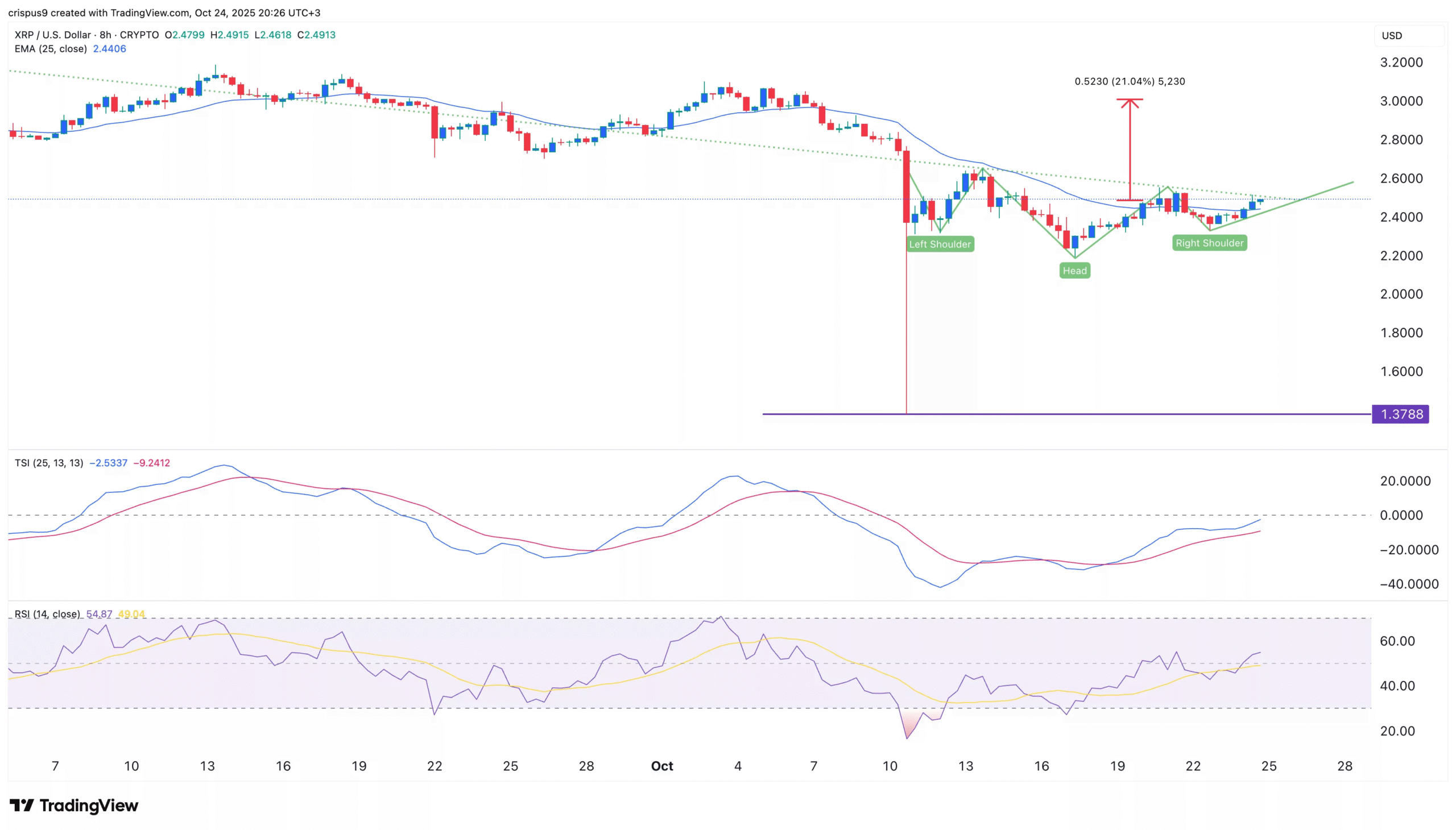 از نظر تکنیکال، نمودار هشتساعته XRP نشان میدهد قیمت پس از کف ۱,۳۷ دلار امسال با تشکیل الگوی «سر و شانه معکوس» در محدوده فعلی، احتمال شکست صعودی تا مقاومت ۳ دلار (حدود ۲۱ درصد بالاتر از سطح فعلی) افزایش یافته است.