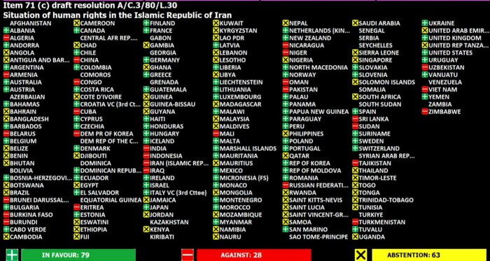 کانادا، آمریکا، اسرائیل، انگلیس، فرانسه، لوگزامبورگ، ایتالیا، استونی، ژاپن، اوکراین و مغرب هم به این قطعنامه ضد ایرانی رای مثبت دادند.