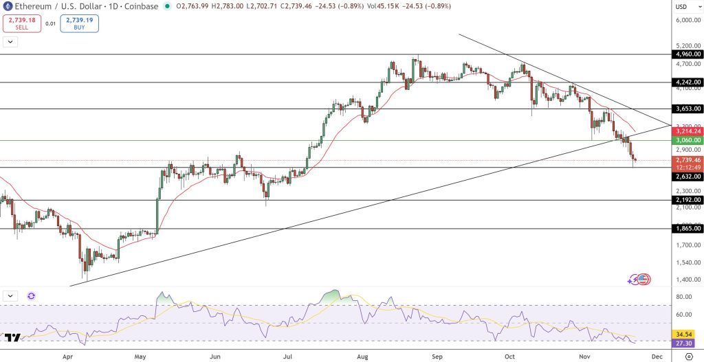 شاخص قدرت نسبی اتریوم در سطح ۲۷، شدیدترین حالت اشباع فروش سال ۲۰۲۵ را نشان می‌دهد. در صورت حفظ حمایت ۲۶۳۰ دلاری، هدف‌های بعدی قیمت در محدوده ۲۹۰۰ تا ۳۰۶۰ دلار و سپس ۳۲۱۴ دلار قرار دارند.