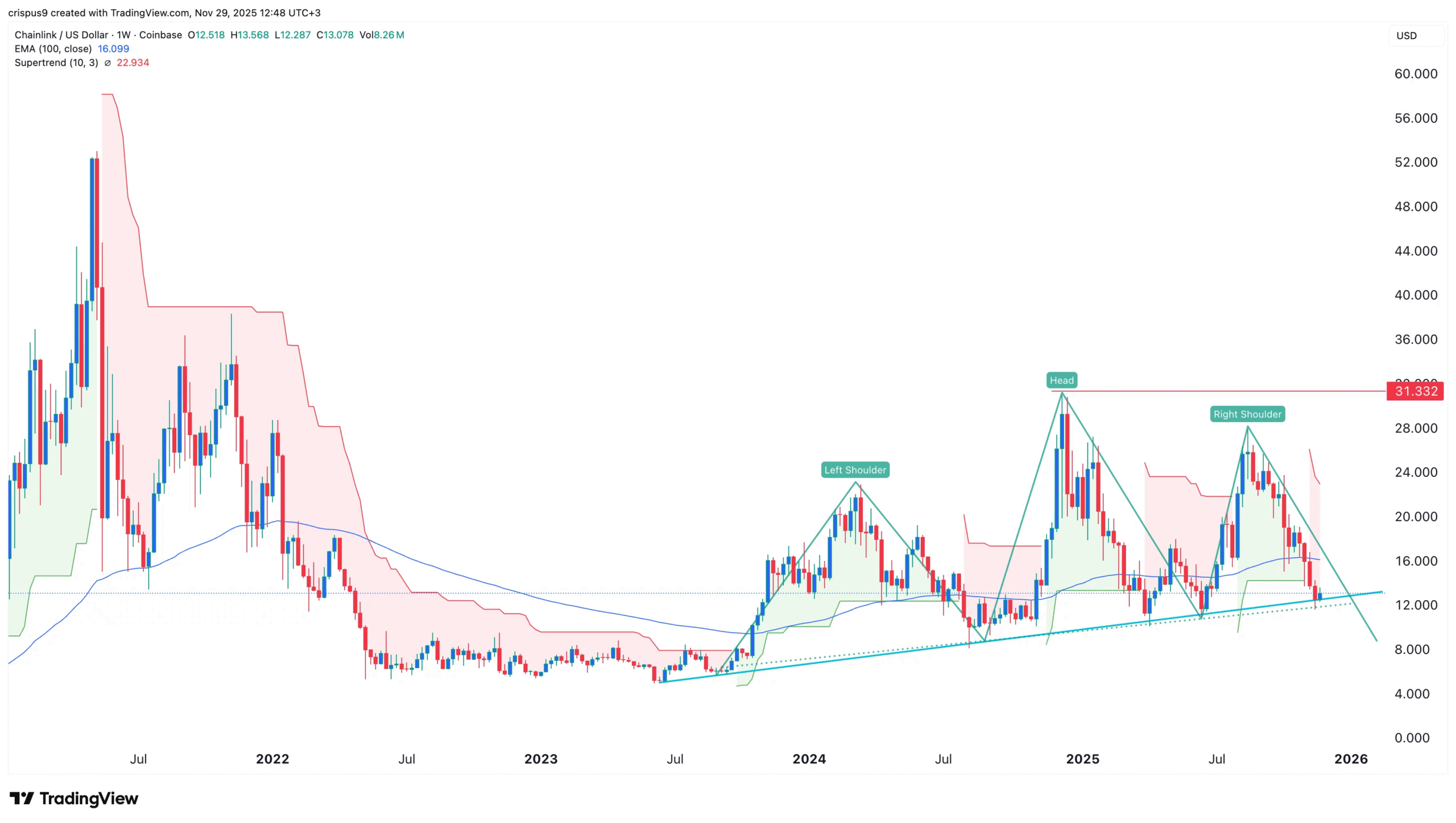 تحلیل تکنیکال در تایم‌فریم هفتگی، تشکیل یک الگوی سر و شانه‌ها را نشان می‌دهد که یک سیگنال بازگشت نزولی محسوب می‌شود. قیمت چین‌لینک هم‌اکنون در خط گردن این الگو و همچنین زیر میانگین متحرک نمایی ۱۰۰ هفته‌ای قرار دارد. در صورت شکست قطعی این سطح، هدف بعدی نزول به ۱۰ دلار و سپس کف سال ۲۰۲۳ در محدوده ۸ دلار خواهد بود.