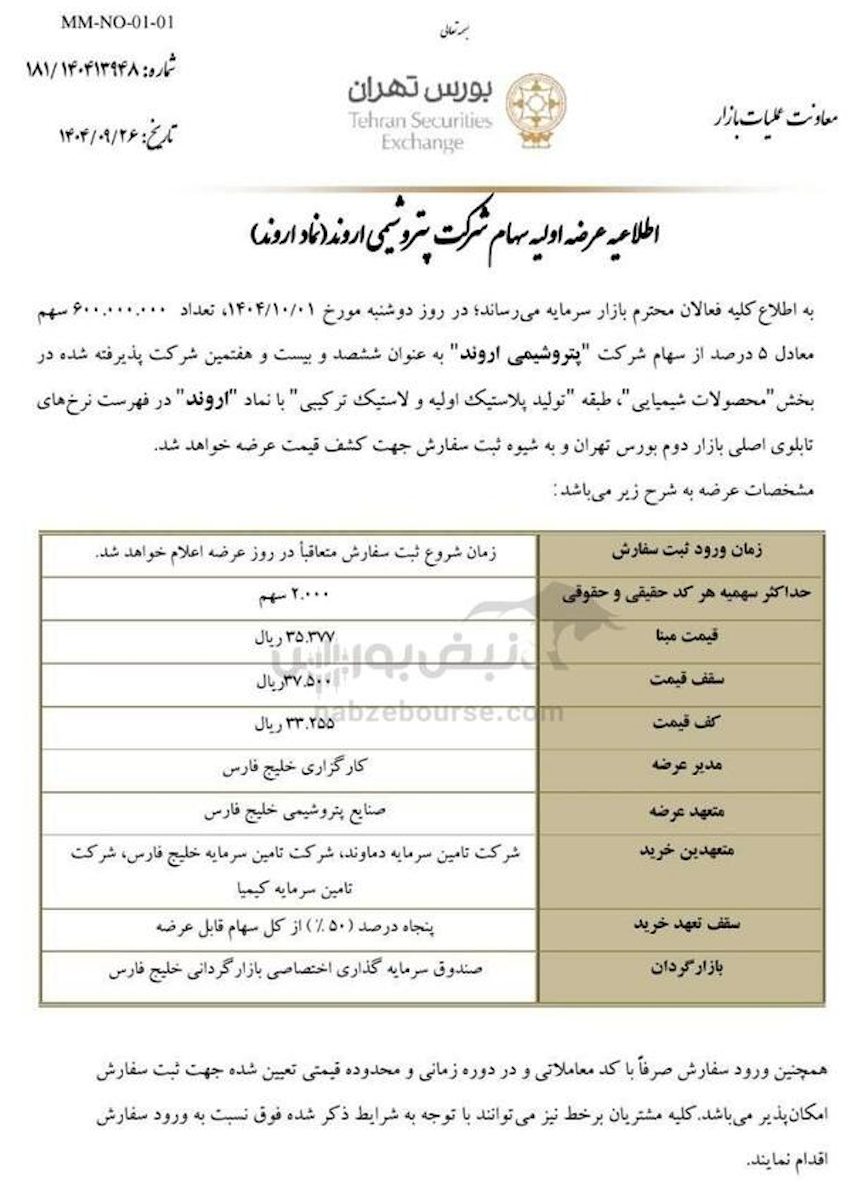 به گزارش بازار، در روز دوشنبه اول دی ماه ۱۴۰۴، تعداد ۶۰۰ میلیون سهم معادل ۵ درصد از سهام شرکت پتروشیمی اروند، به عنوان ششصد و بیست و هفتمین شرکت پذیرفته‌شده در بورس اوراق بهادار تهران، در بخش محصولات شیمیایی و طبقه تولید پلاستیک اولیه و لاستیک ترکیبی، با نماد معاملاتی «اروند» در تابلوی اصلی بازار دوم بورس تهران عرضه خواهد شد.