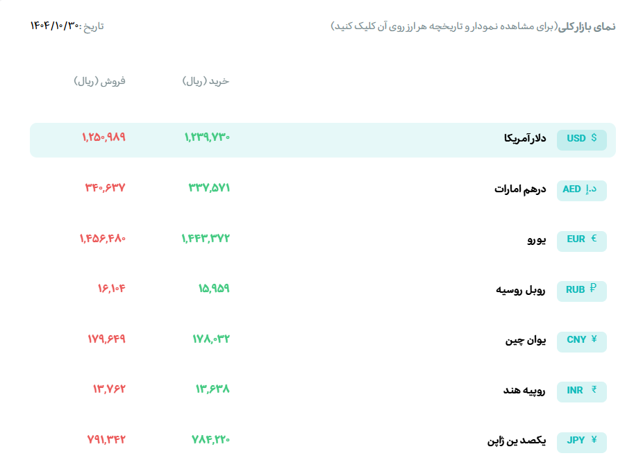 در جریان معاملات روز دوشنبه ۲۹ دیماه، مجموع دادوستدهای انجامشده در بازار ارز تجاری مرکز مبادله ایران به تفکیک نوع ارز شامل ۱۶۴.۶ میلیون دلار، ۱۴۶.۸ میلیون درهم، ۸.۲ میلیون یورو و ۱.۹ میلیون یوآن بوده است که ارزش دلاری مجموع این معاملات معادل ۲۱۴.۴ میلیون دلار برآورد میشود.