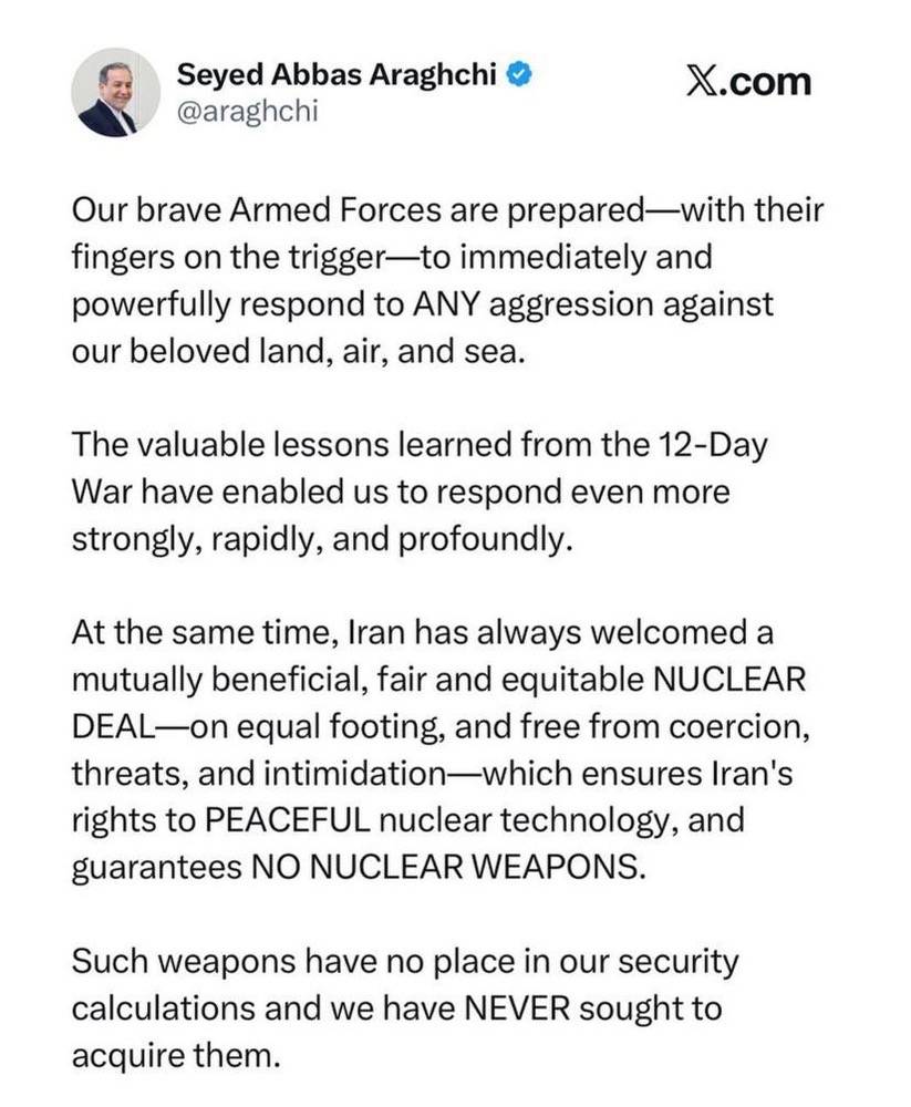 عراقچی در این خصوص در شبکه ایکس نوشت:در عین حال، ایران همواره از یک توافق هسته‌ای منصفانه، عادلانه و مبتنی بر منافع متقابل استقبال کرده است. توافقی که از موضع برابر و عاری از هرگونه اجبار، تهدید و ارعاب باشد. توافقی که نسبت به تامین حقوق ایران برای برخورداری از فناوری صلح آمیز هسته‌ای اطمینان دهد و عدم دستیابی به سلاح هسته‌ای را تضمین کند.