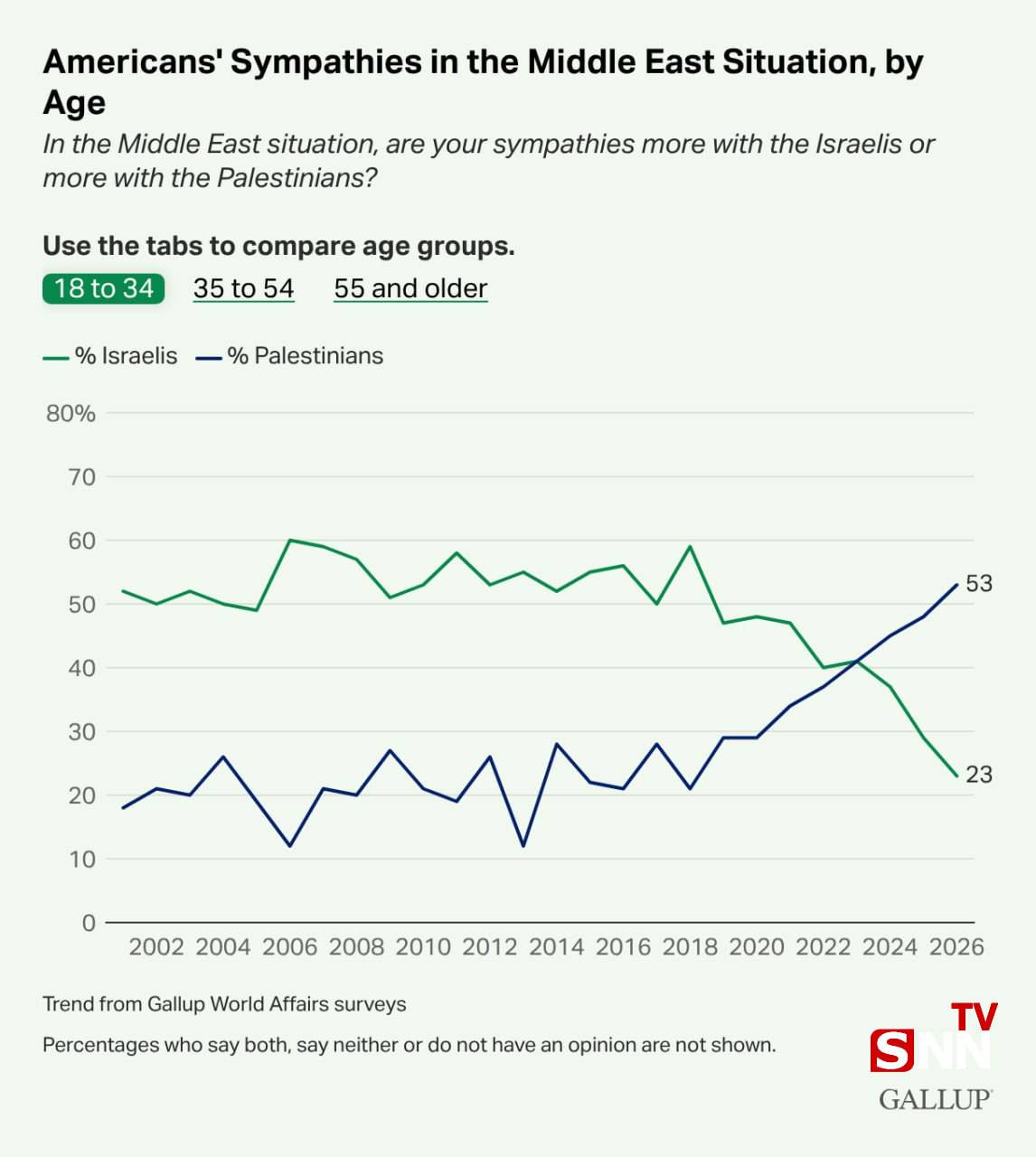 در میان افراد ۱۸ تا ۳۴ سال، ۵۳ درصد اعلام کرده‌اند که بیشتر با فلسطینی‌ها همدلی دارند؛ این نخستین‌بار است که این دیدگاه به اکثریت می‌رسد.