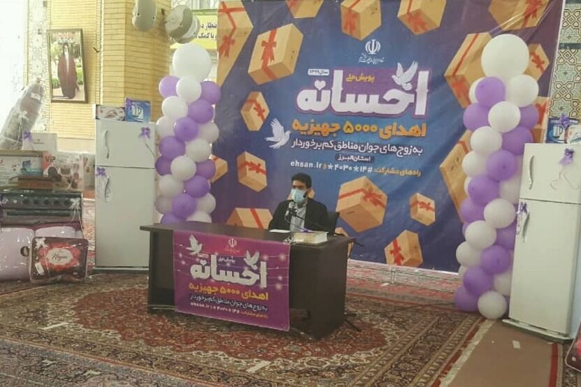 پورسلیمانی با بیان اینکه سهم استان البرز در تهیه و توزیع جهیزیه بین زوج های نیازمند ۱۵۰ دست جهیزیه بوده گفت : ۱۸ سری از این اقلام بین زوج های نیازمند توزیع شد. هر سری جهیزیه شامل «یخچال ۱۴ فوت، تلوزیون رنگی ۲۴ اینچ، فرش ماشینی ۹ متری اتوبخار، سرویس خواب، بسته فرهنگی، اجاق گاز پنج شعله، قابلمه ۱۷ پارچه، ظروف چینی ۶ نفره، چای ساز، پتو دونفره، قاشق و چنگال ۶ نفره» می باشد. از این تعداد ۴ سری به صورت غیرمشارکتی و بدون آورده گروه های جهادی توزیع شده و مابقی مشارکتی بوده که برای هر سری جهیزیه آورده گروه های جهادی ۵ میلیون تومان و مابقی بر عهده ستاد بوده است.
