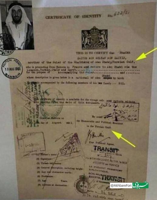 تصویر زیر گذرنامه بنیانگذار امارات متحده عربی در سال ۱۹۵۱ میلادی است که دو بار نام خلیج فارس در آن ذکر شده است.