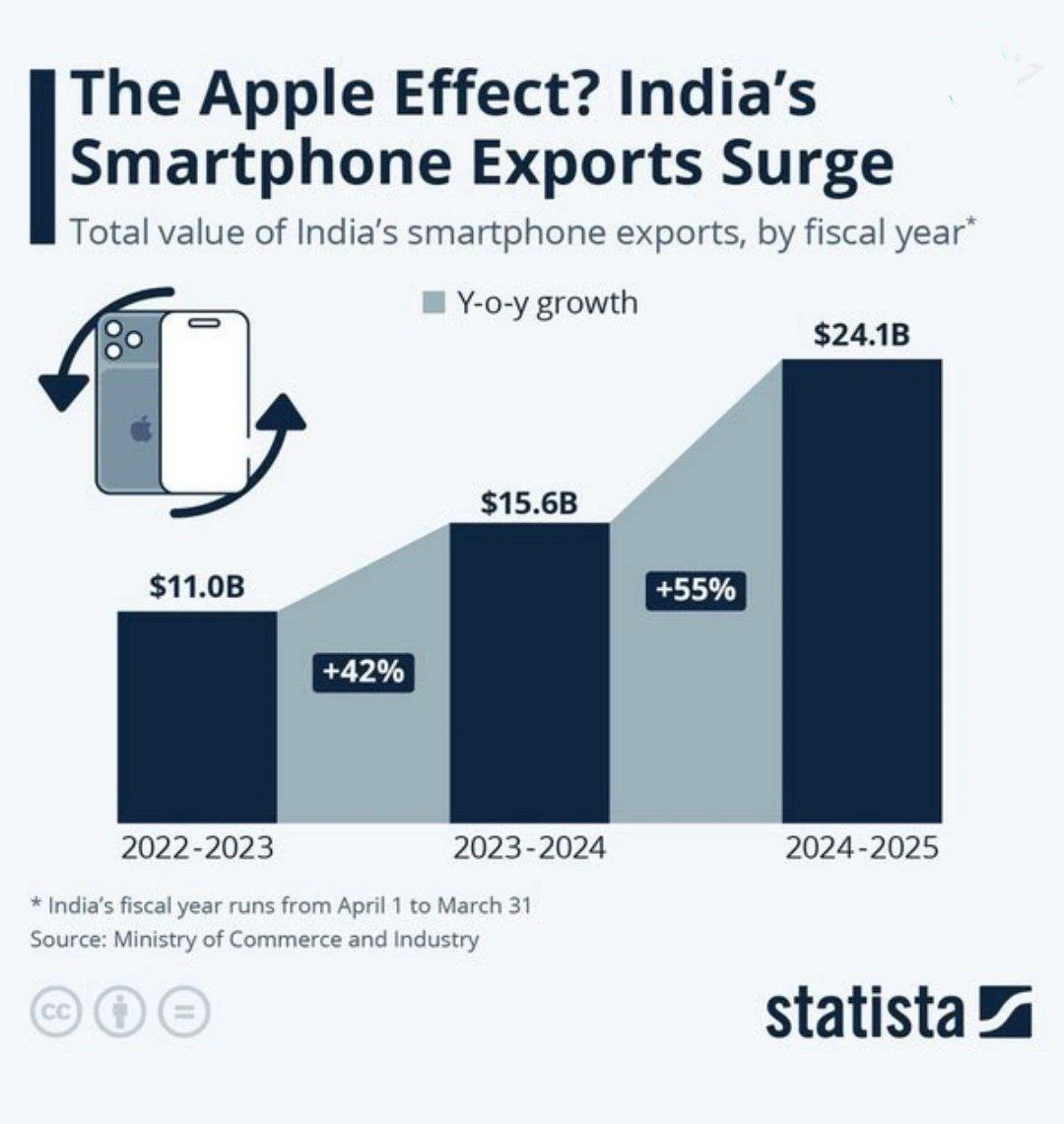 صادرات تلفن هوشمند هند به سرعت رو به رشد است و دلیل آن انتقال تولید اپل از چین به هند است.