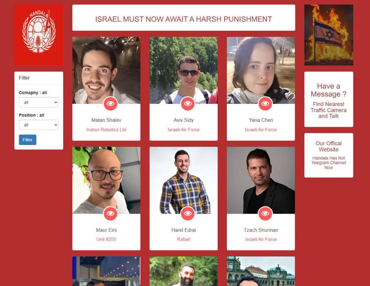 این تروریستهای کودک کش در صنایع نظامی، یکان ۸۲۰۰، نیروی هوایی، ساختار فناوری و... مشغول هستند. اطلاعات هر فرد در وب سایتی که حنظله برای این کار اختصاص داده اعلام شده است.
