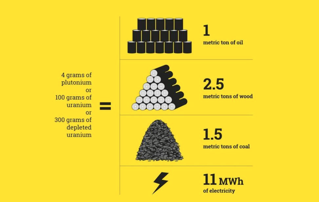 برای تولید ۱۱ مگاوات برق معادل مصرف یک شهرک کوچک، تنها ۱۰۰ گرم اورانیوم کافی است؛ در حالی که همین میزان انرژی نیازمند مصرف یک تُن نفت، ۱.۵ تُن زغالسنگ یا ۲.۵ تُن چوب است.