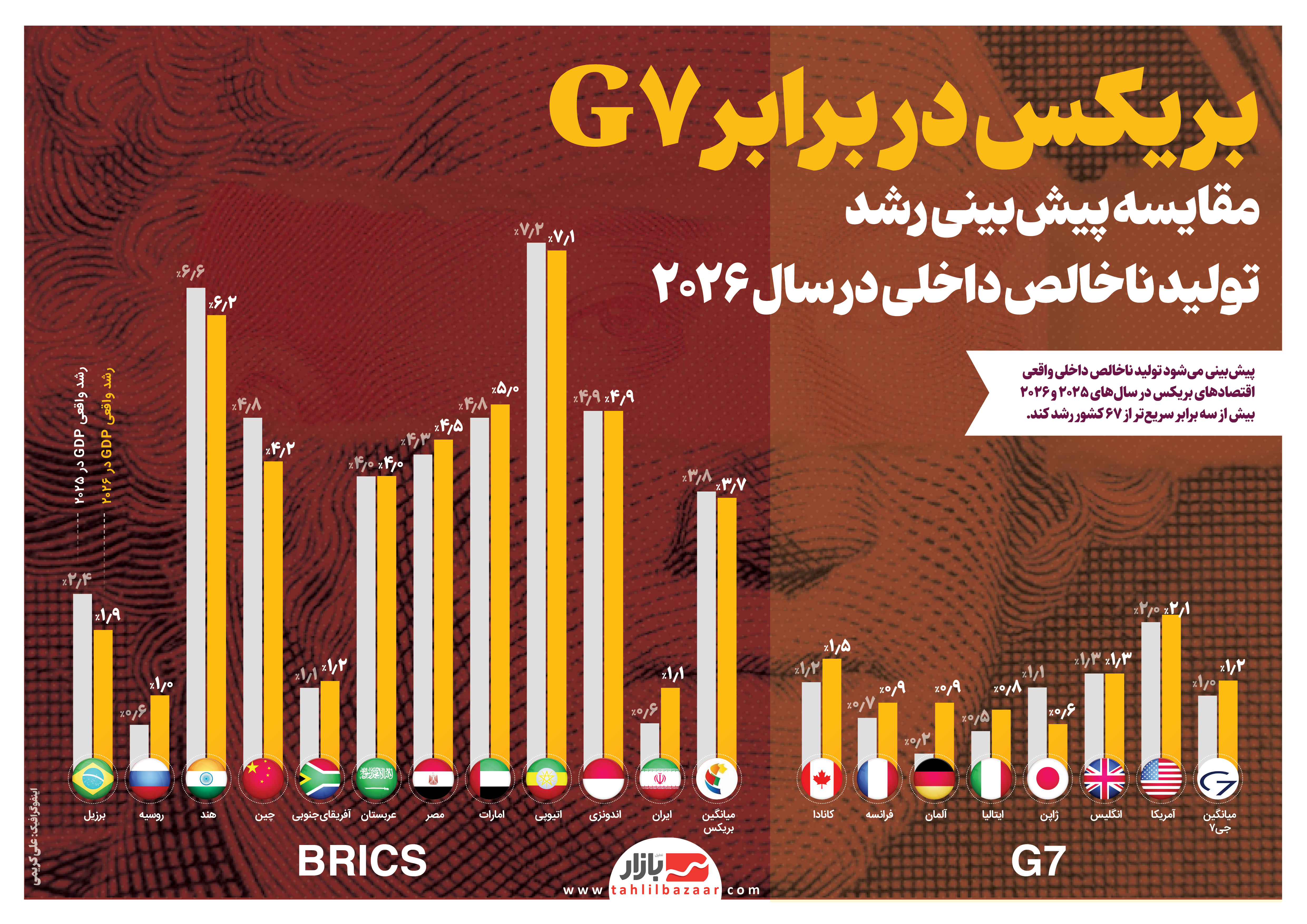 پیش‌بینی می‌شود تولید ناخالص داخلی واقعی اقتصادهای بریکس در سال‌های ۲۰۲۵ و ۲۰۲۶ بیش از سه برابر سریع‌تر از ۶۷ کشور رشد کند.