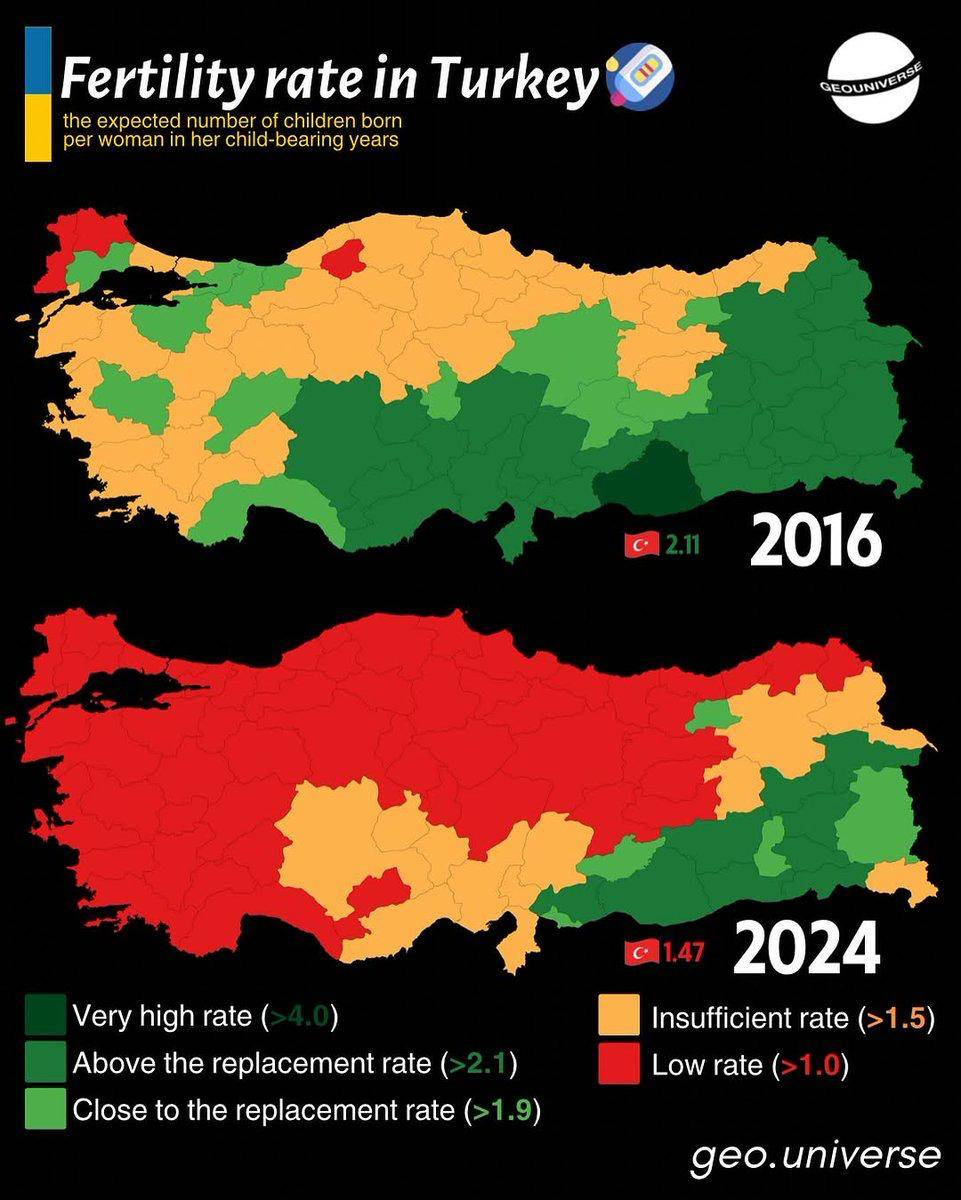 نرخ باروری زنان در ترکیه در طی سال های ۲۰۱۶ تا ۲۰۲۴ به طرز چشمگیری کاهش یافته است.