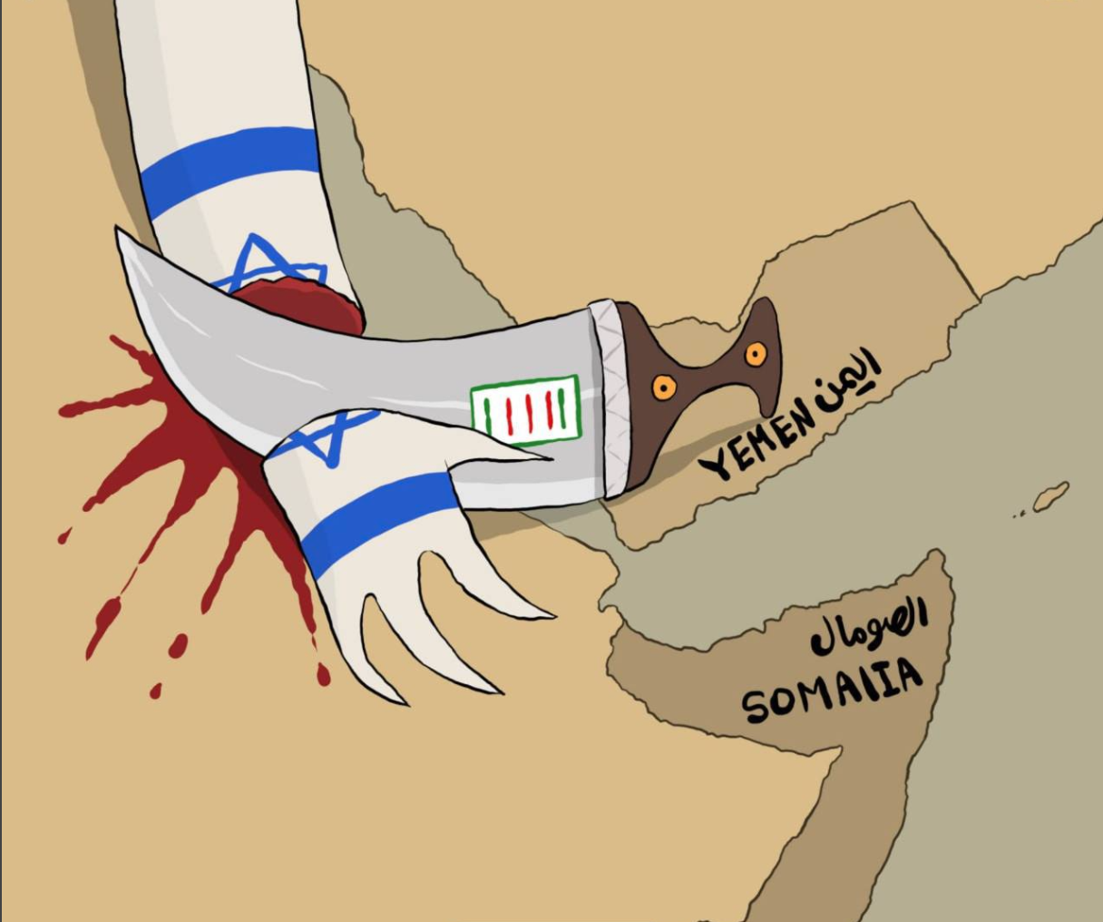 کاریکاتوری که خبرگزاری رسمی یمن درباره تلاش صهیونیستها برای نفوذ به سومالی و منطقه شاخ آفریقا منتشر کرده است.