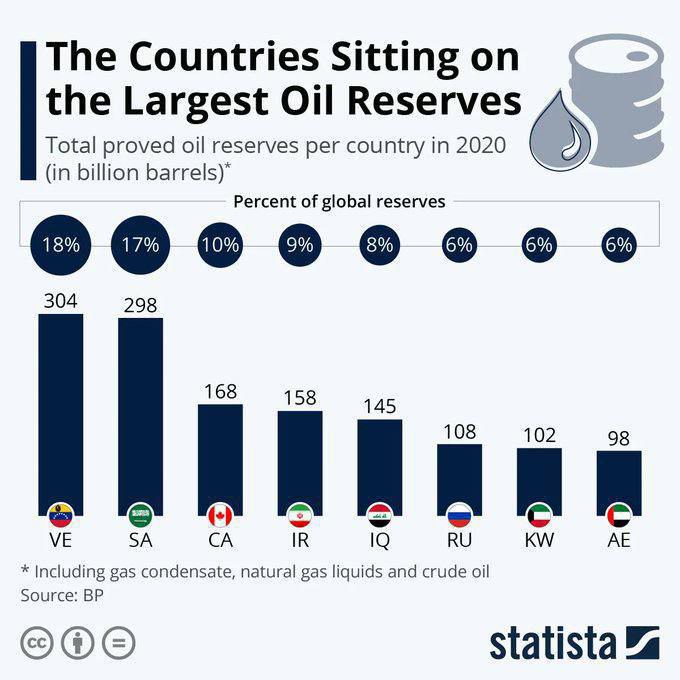 ونزوئلا بالاتر از عربستان سعودی دارای 18 درصد از ذخایر نفت جهان است.
