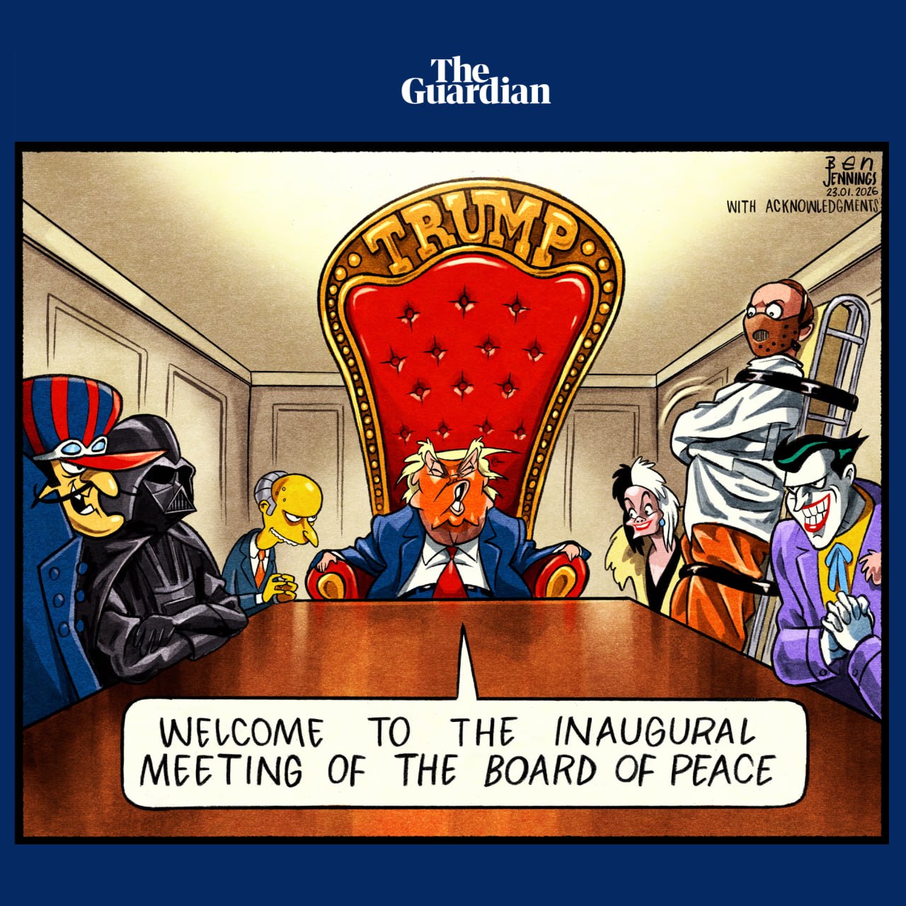 روزنامه انگلیسی گاردین، با انتشار کاریکاتوری درباره شورای صلح ترامپ، شرورترین و دیوانهترین شخصیتهای داستانی را در کنار او نشانده است.
