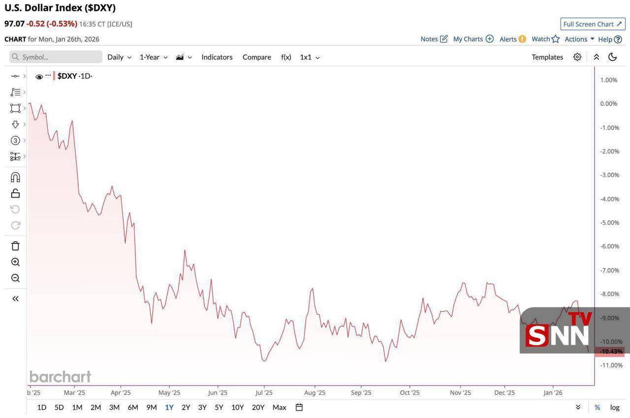 دلار آمریکا در ۱۲ ماه گذشته بیش از ۱۰٪ از ارزش جهانی خود را نسبت به سایر ارزها از دست داده است، نشان دهنده روند نزولی قابل توجه و فشار اقتصادی بر اقتصاد آمریکا است.