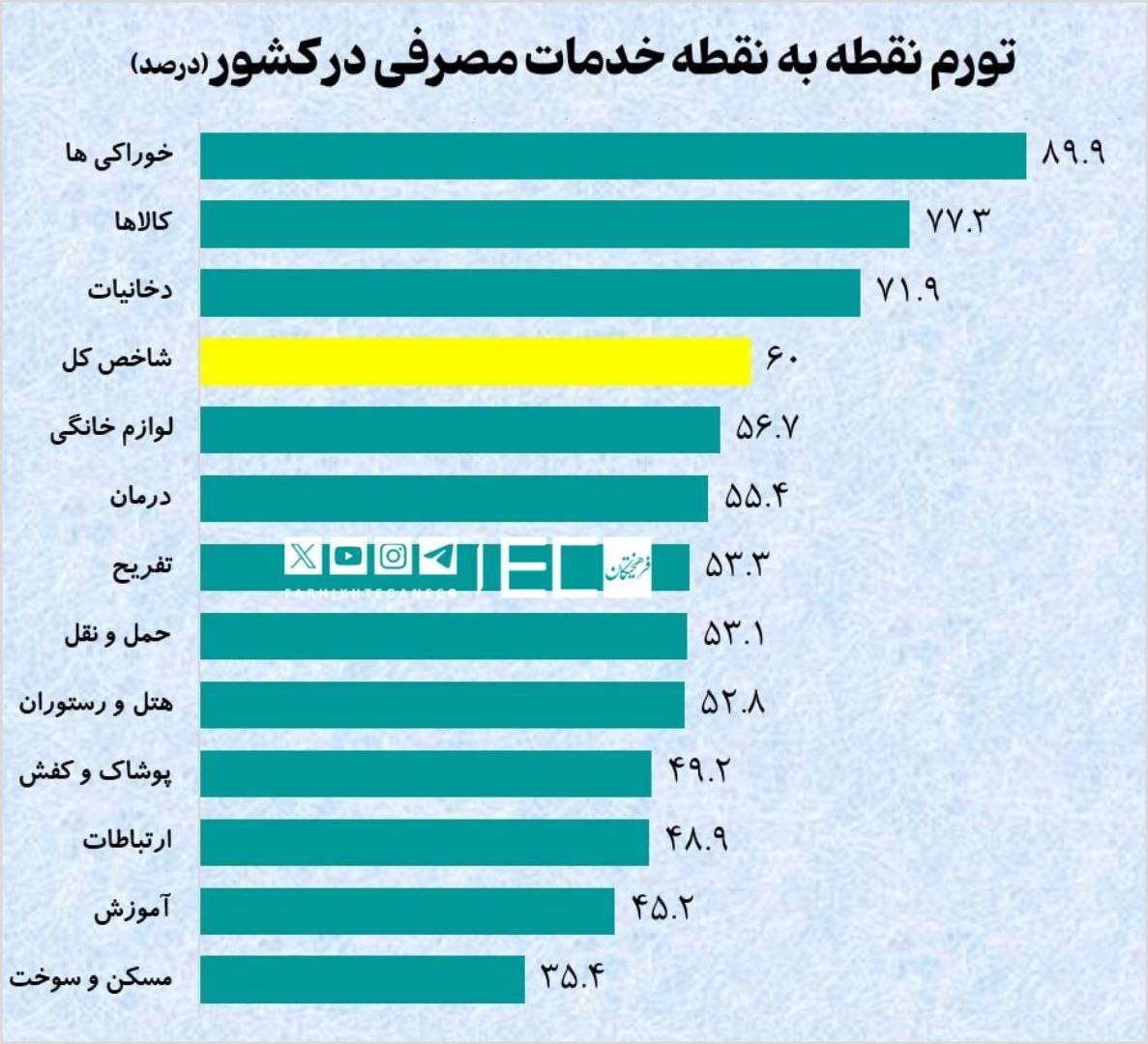 تورم خوراکیها در پایان دی ماه، در مرز ۹۰ درصد قرار گرفت. تورم نقطه به نقطه دخانیات به ۷۲ درصد رسیده و همچنین تورم تفریح نیز در دیماه به ۵۳ درصد رسیده است.
